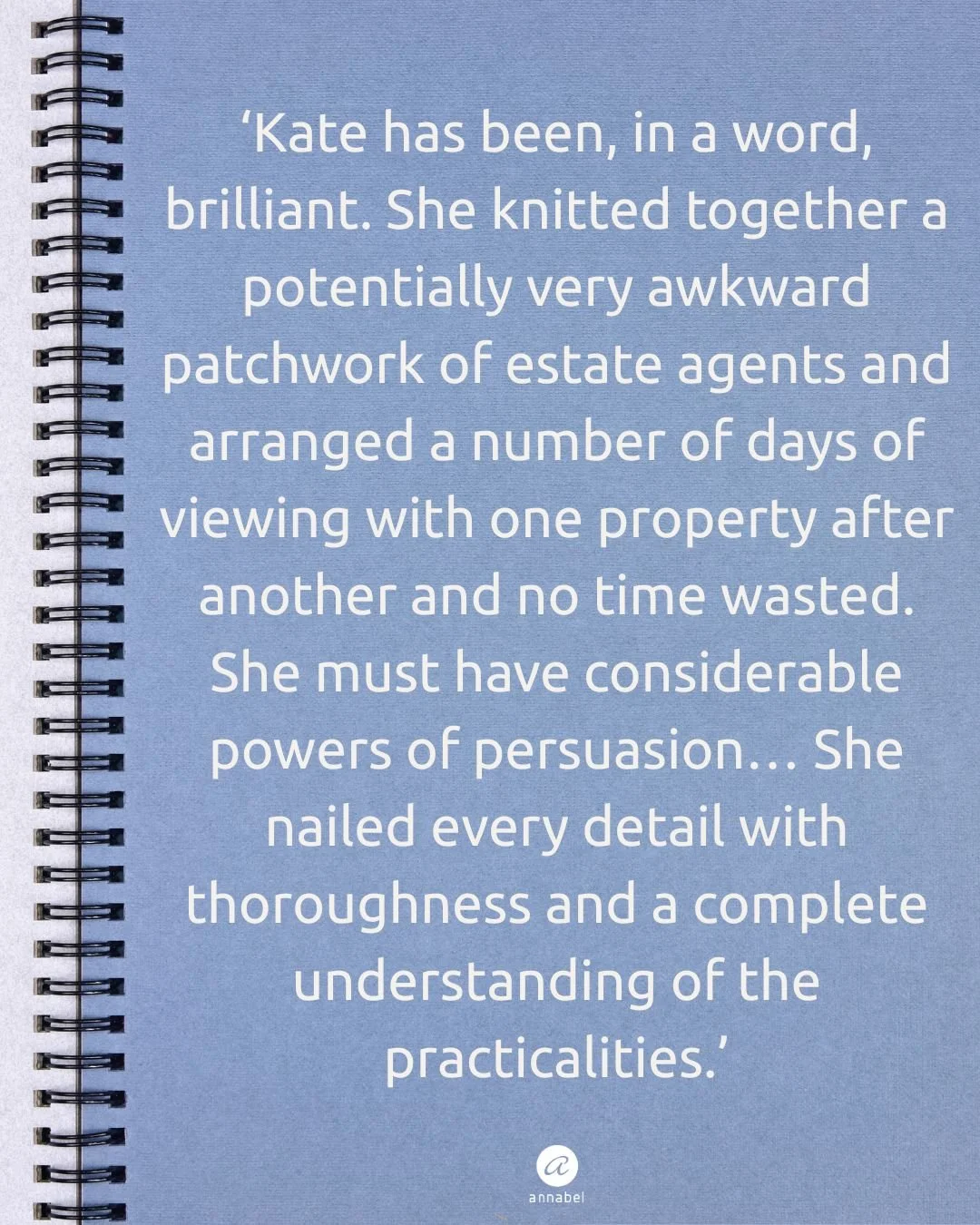 "Annabel has been working for us for five years. When she came my husband had just retired and his papers were in complete chaos. She had to work very hard to get it all ordered and filed properly as he has a complicated and very varied business life. Annabel is exceptionally efficient; her eye is on everything, making sure that all is dealt with immediately and discreetly. She also helps me when I need her to. Annabel is a calming presence in the house, we rely on her totally and we look forward to her coming each week."